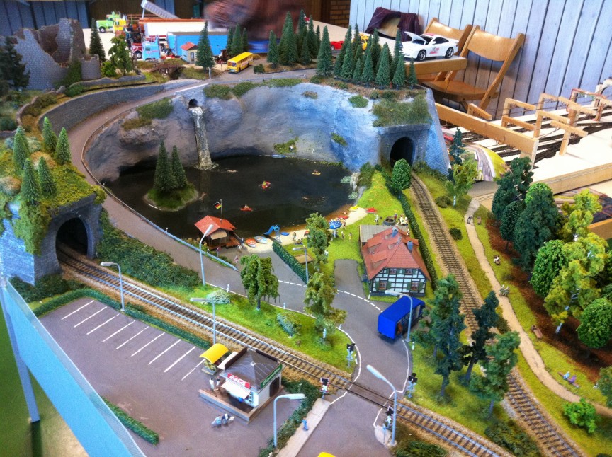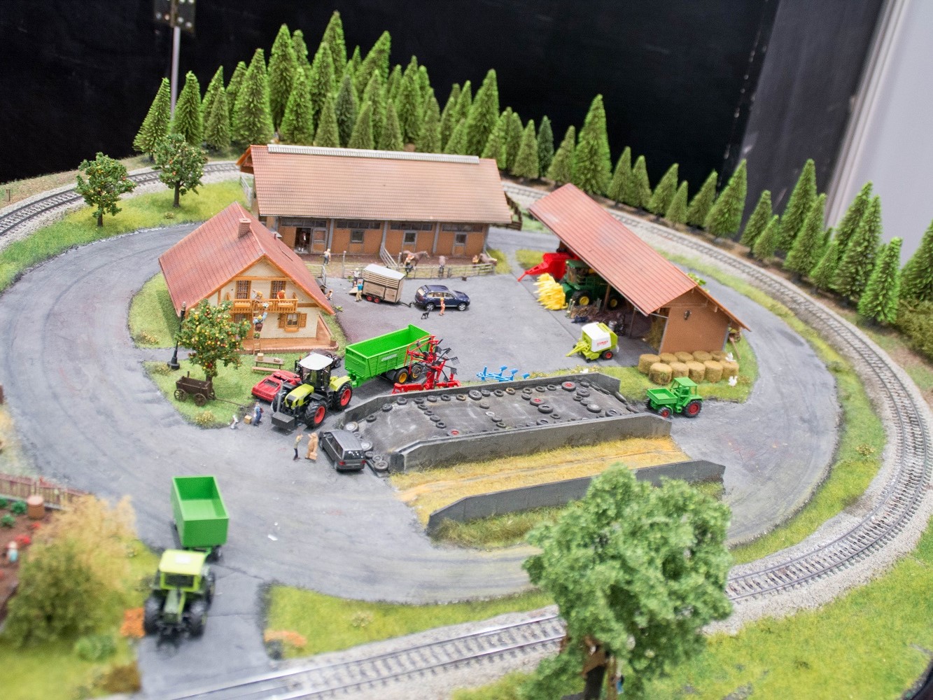 Die Modellbahn ist in vier Hauptbereiche aufgeteilt. Dem Hauptbahnhof, Betriebswerk, Bauernhof und dem See.