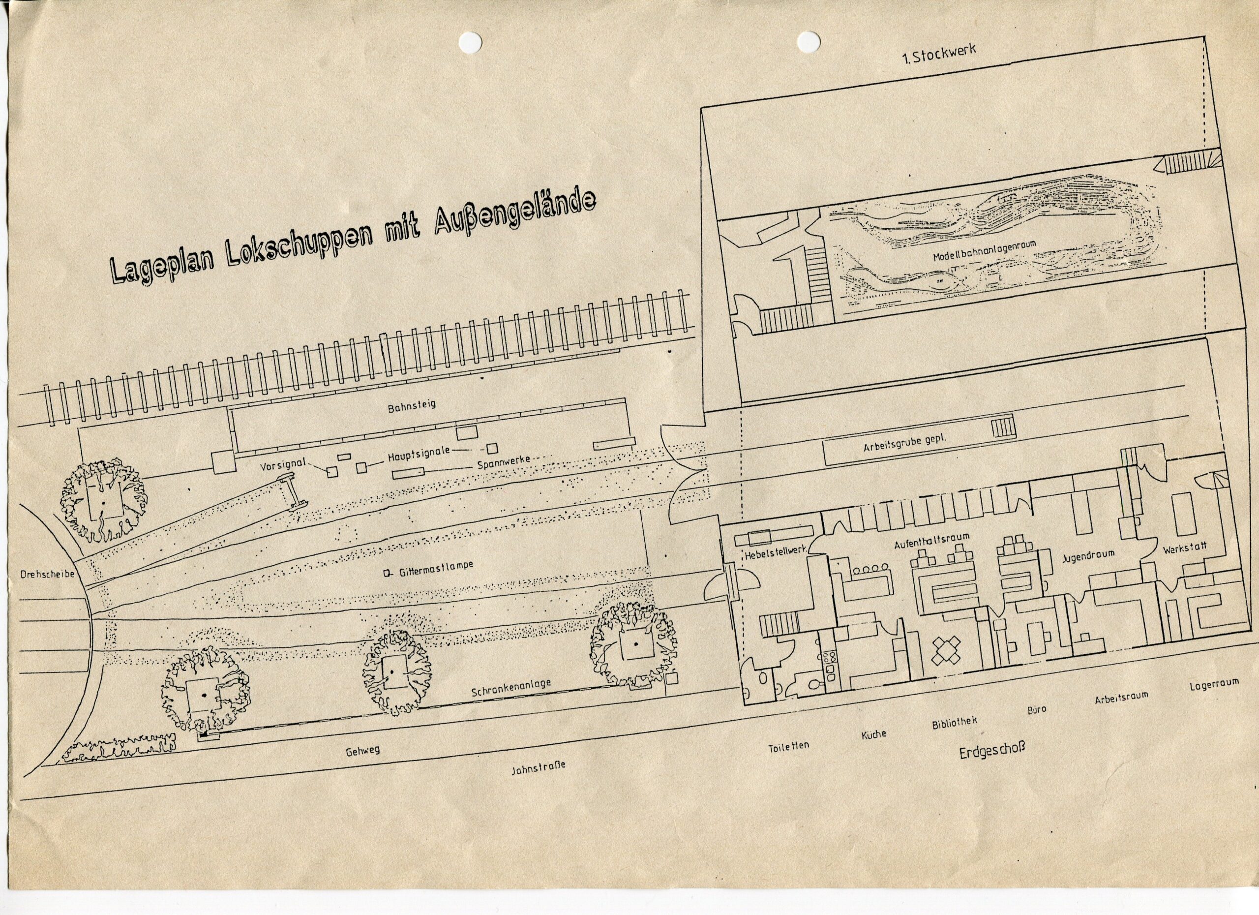 Im Seitentrakt sind die Toiletten, Küche, Technikraum, das Büro und ein Elektronikraum. Das gesamte Obergeschoß beherbergt die im Aufbau befindliche Dreileiter-H0-Modellbahnanlage mit Fahrzeuglift.